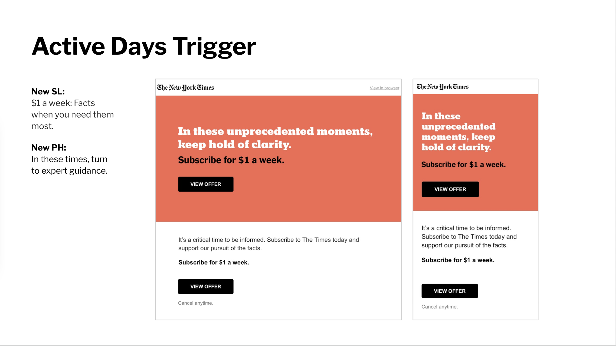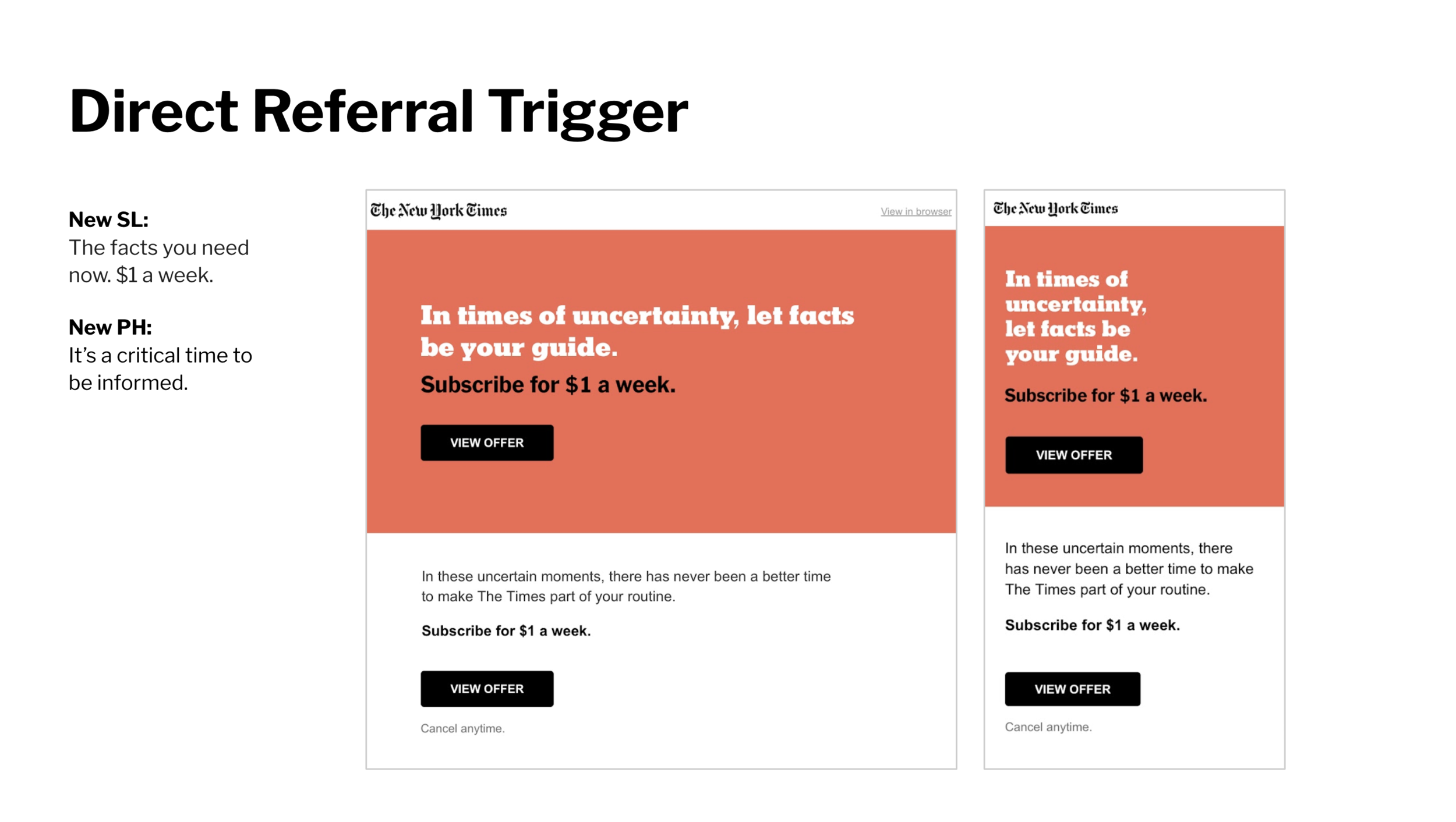 Using the data that we gathered from our new access model, that made free readers give us their email, we were able to target them based on their behavior. Whether they came back to us everyday, read our morning newsletter, or bookmarked our homepage — we sent them emails that alludes to their behavior without being creeps, and helped contribute to one of NYT’s best sales quarter since their “Trump Bump”.